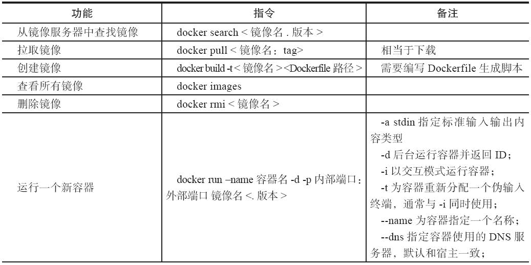 为了使用 Docker,需要学习 Docker 的一些指令。表 9-1 列出了一些主要指令的功能,将在下节结合实际操作来演示如何使用这些指令。