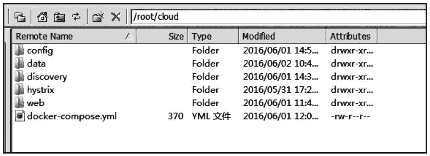 打包完成后,可将 jar 文件和各个模块中创建镜像的脚本 Dockerfile 上传到安装有 Docker 服务的 Linux 服务器上(实例工程的各个模块已经准备好了创建镜像的脚本,分别存放在各个模块的 docker 目录下面)。可以在 Linux 服务器中为各个模块创建一个目录,分别用来存放各个模块的 jar 和 Dockerfile 文件。例如,使用如图 9-1 所示的方式创建目录结构。