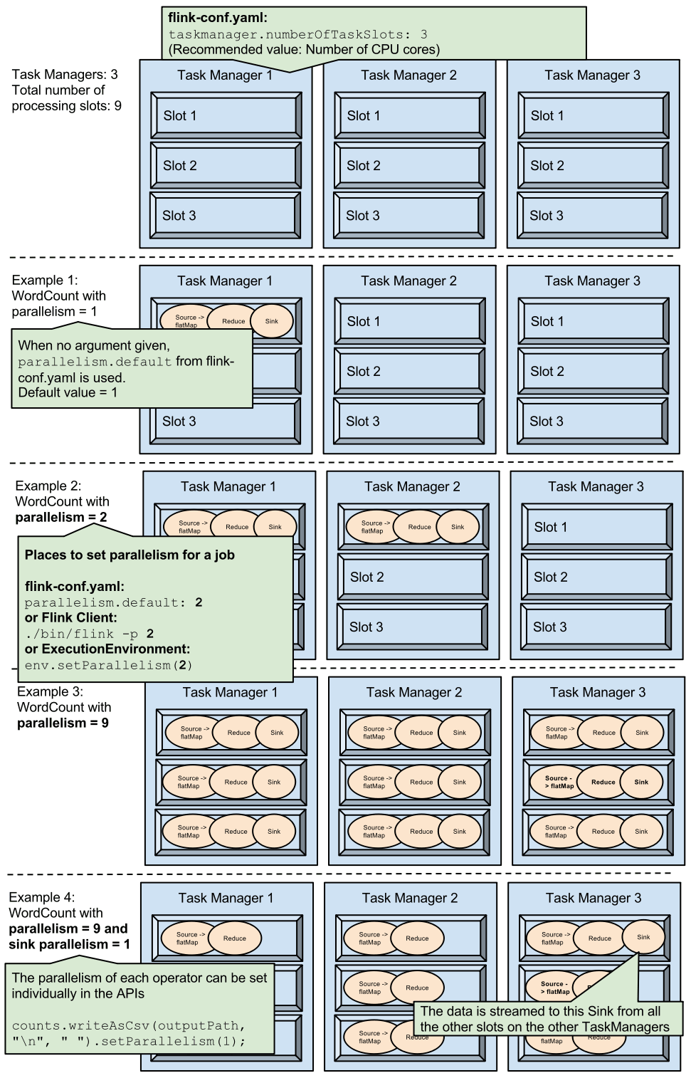 缓冲器的上一个 TaskManager 所要求数量为 总度的平行度 (数的目标)* 节点内并行性 (源在一个 TaskManager 数)× N 与 N 是限定多少 repartitioning-恒定/您希望同时处于活动状态的广播步骤.由于 节点内并行 性通常是核心数量,并且超过 4 个重新分区或广播频道很少并行活动,因此它经常归结为
