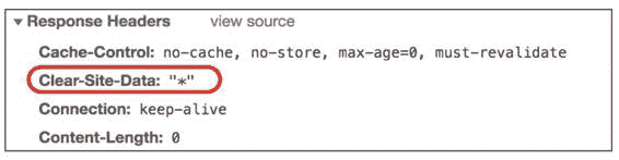 在注销登录的处理器中,设置了清除浏览器所有和当前网站相关的数据。配置完成后,当浏览器发起注销登录请求时,响应头中就会有 Clear-Site-Data,如图 9-13 所示。