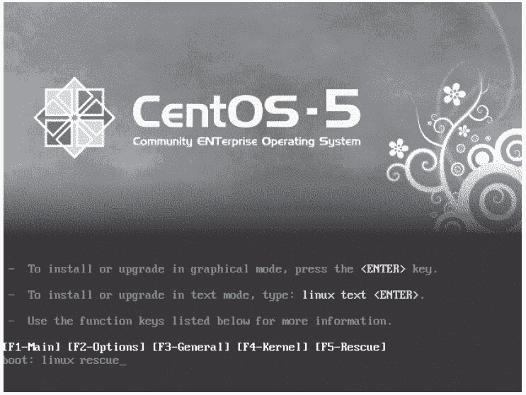 首先将系统光盘放入光驱,设置 BIOS 从光驱启动,这样系统就从光驱引导,然后在 boot 后输入:linux rescue,如图 4-1 所示。