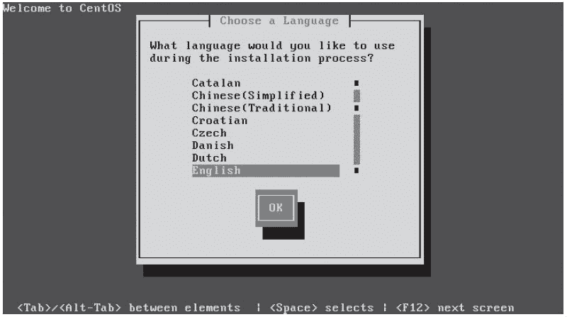 接着系统开始自动引导,进入图 4-2 所示画面。这里是选择模式使用的语言,可以按照自己的需要设定。在这里我们选择“English”,然后按 tab 键,选中“OK”,按回车键进入下一步。