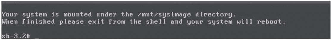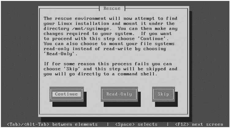 接下来进入最关键的步骤,如图 4-5 所示,修复模式会自动将系统的所有分区挂载到/mnt/sysimage 目录下,选择“Continue”,则修复环境进入 read-write 状态下,可以对分区进行读写操作;选择“Read-Only”,修复环境进入只读模式。由于我们要重建 fstab 文件到/etc 目录下,因此选择“Continue”进入可读写模式下。