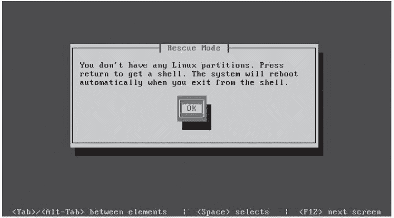 接下来是一个友情提示界面,如图 4-6 所示,由于 fstab 文件丢失,修复模式找不到任何可挂载的分区,从这里可知,修复模式在这里也读取了/etc/fstab 文件,按回车键进入下一步。