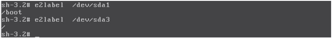 由于分区并没有损坏,仅仅是/etc/fstab 文件丢失,通过 fdisk 命令可以查看到系统分区的完整信息,但是每个分区对应的 label name 信息还不知道,不过可以通过 e2label 命令查看每个分区对应的 label name,如图 4-9 所示。