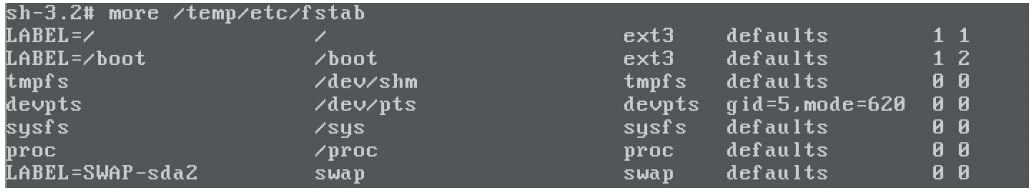 通过这种方式将原有根分区的文件全部挂载到/temp 目录下,接着就可以创建我们需要的 fatab 文件了。恢复完成的 fstab 文件内容如图 4-11 所示。