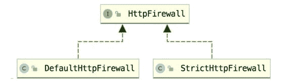 - StrictHttpFirewall:这是一个检查严格的 Http 防火墙,也是框架默认使用的 Http 防火墙。