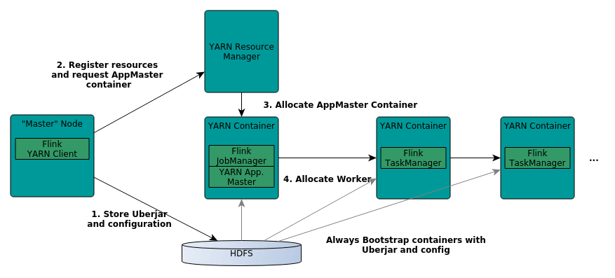 之后,AM 开始为 Flink 的 TaskManagers 分配容器,这将从 HDFS 下载 jar 文件和修改后的配置。完成这些步骤后,即可建立 Flink 并准备接受作业。