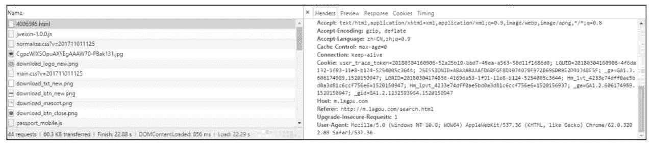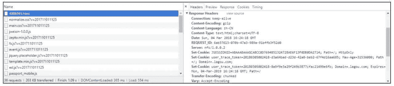 可以看到 Cookies 中包含类似 user_trace_token、JSESSIONID、LGRID 等字段,应该高度怀疑拉勾网可能是在初次访问时设置了我们的 Cookies,然后通过后续检测 Cookies 是否满足其设置来判断是真正的浏览器还是爬虫在访问。