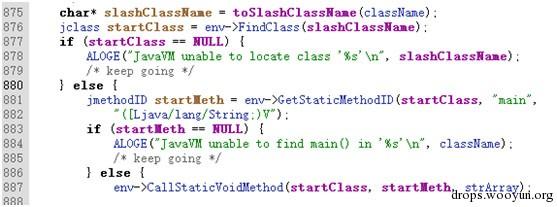 整个启动过程是从app_processs(/frameworks/base/cmds/app_process/app_main.cpp)开始的,创建了一个对象AppRuntime runtime,这个是一个单例,整个系统运行时只有一个。随着zygote的fork过程,只是在不断地复制指向这个对象的指针个每个子进程。然后就开始执行runtime.start方法。这个方法里先调用startVm启动虚拟机。是由JNI_CreateJavaVM方法具体执行的的,即/art/runtime/jni_internal.cc的 extern "C" jintJNI_CreateJavaVM(JavaVM** p_vm, JNIEnv** p_env, void* vm_args)。然后调用startReg注册一些native的method。在最后比较重要的是查找到要执行的java代码的main方法,然后执行进入托管代码的世界,这也是我们感兴趣的地方。