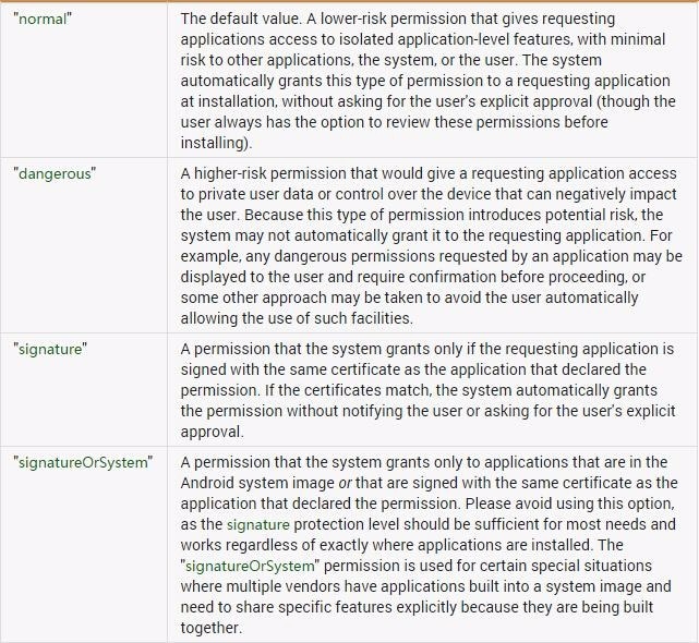- 尽可能的不发送敏感信息,应考虑到启动public Activity 中intent 的信息均有可能被恶意应用窃取的风险