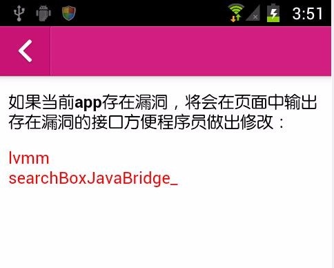 用户在使用包含此漏洞的应用访问特定的网页时会执行网页中的恶意代码,可导致手机被远程控制。相关漏洞代码示例如下: