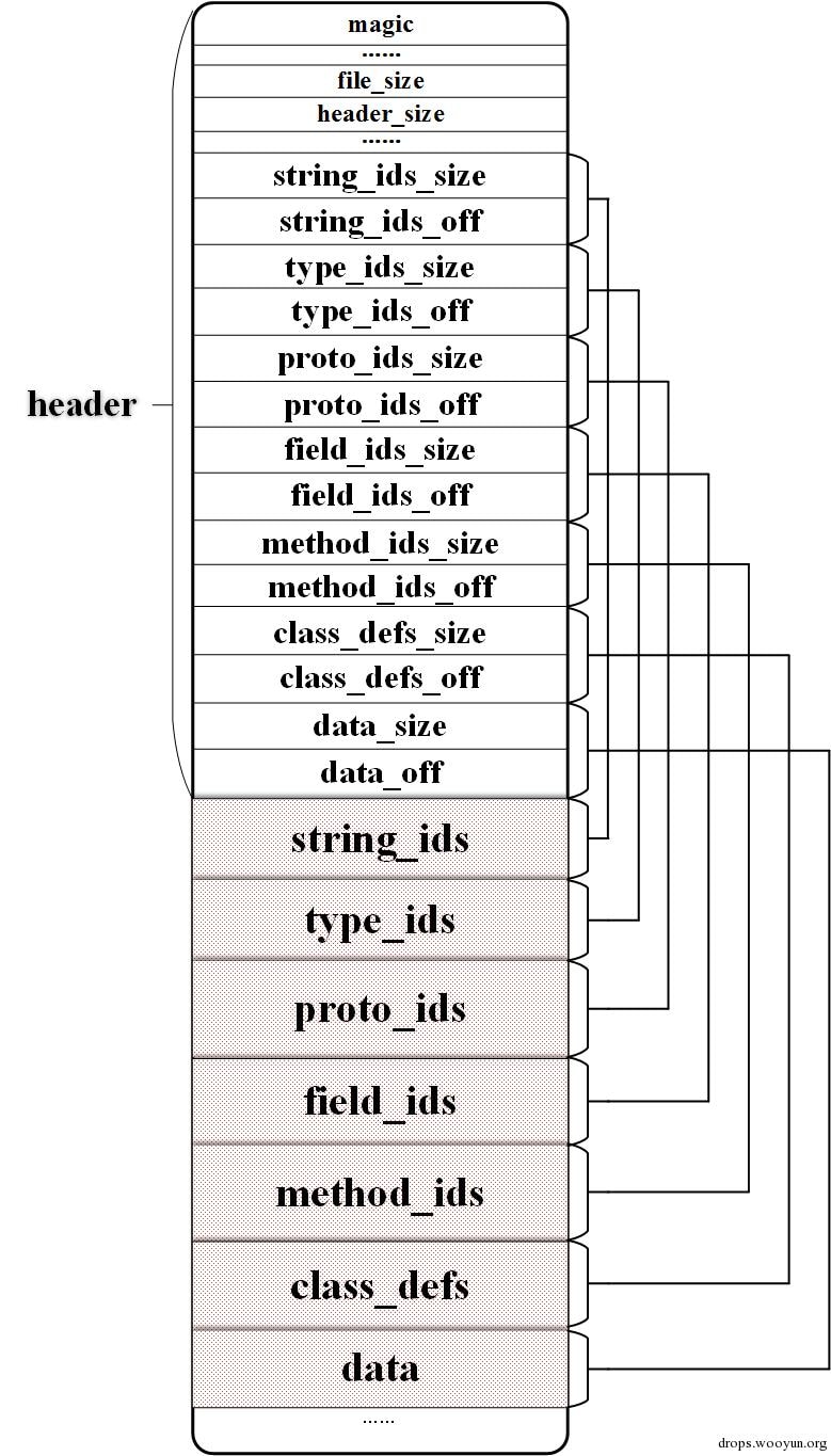 首当其冲,要脱壳少不了研究一下Dex文件的格式,这一点Android的官方文档写的已经很清晰了,我这里就简单再提一下。整个结构便如图1所示: