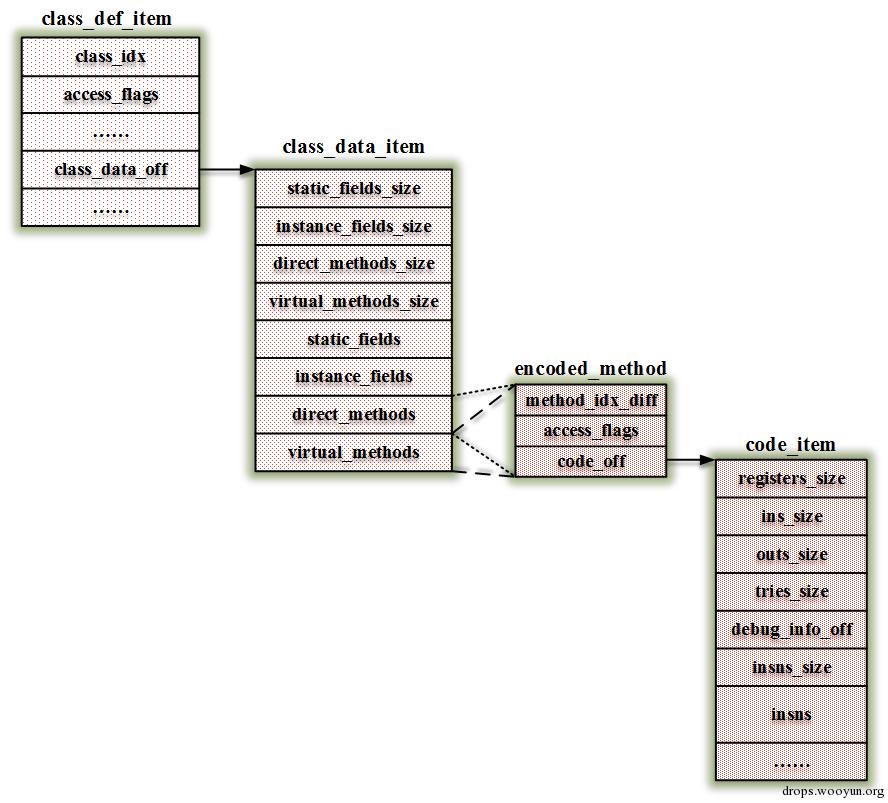 每个class_def_item指向一个class_data_item,每个class_data_item 包含了一个class的数据,每个方法用encoded_method结构来描述,它又指向了一个code_item,这个里面就保存着一个方法的所有指令。