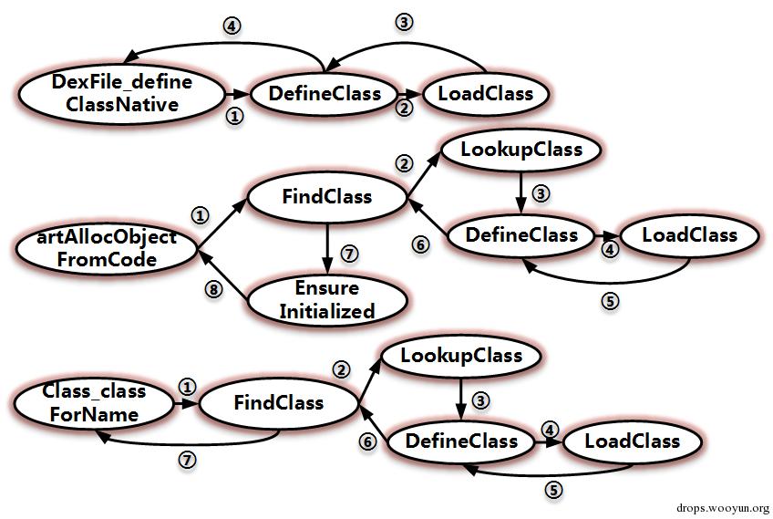 这个就是遍历dex文件中class_defs区段里每一个class_def_item,并逐一加载和初始化,在ART里我们使用FindClass函数来加载类,EnsureInitialized进行初始化;在DVM中用dvmDefineClass加载,dvmIsClassInitialized 和dvmInitClass来初始化。