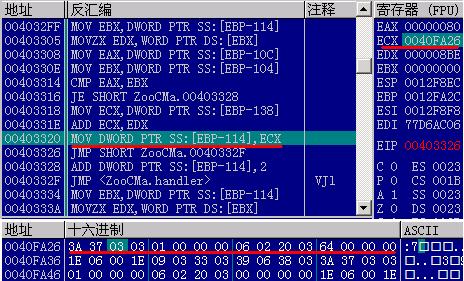 00403320 . 898D ECFEFFFF MOV DWORD PTR SS:[EBP-114],ECX //__eip=跳转目的地址
